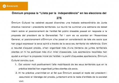 Òmnium proposa una 'llista per la independència' per al 27-S amb societat civil i 'suport explícit' de partits
